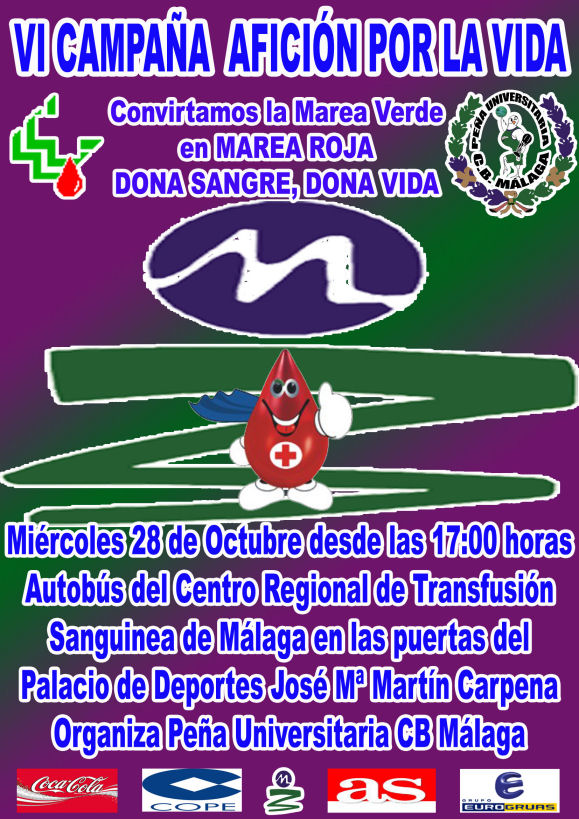 Una vez más organizamos la Campaña “AFICIÓN POR LA VIDA” junto al Centro Regional de Transfusión Sanguínea de Málaga y el C. B. Málaga. En su sexta edición, el objetivo de la campaña