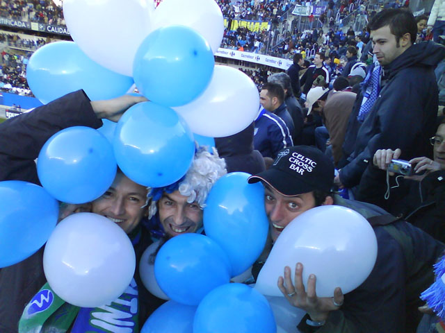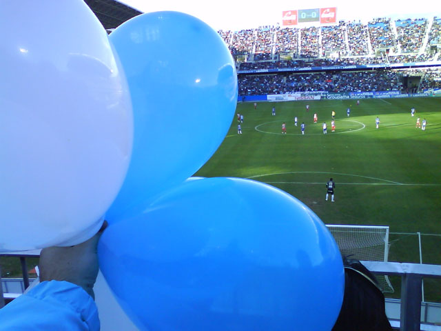 La Peña Universitaria, para poner nuestro granito de arena, hemos comprado 20000 globos blanquiazules que vamos a repartir entre las gradas de Gol, Preferencia y Tribuna (sitios del campo donde están la mayoría de nuestros socios).