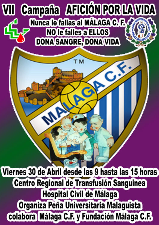 Os informamos de la VII CAMPAÑA “AFICIÓN POR LA VIDA”, que una vez más emprendemos junto al Centro Regional de Transfusión Sanguínea de Málaga y el Málaga CF, con el objetivo de obtener un