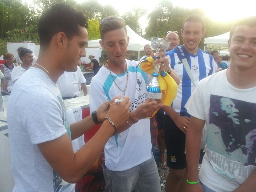 Kiko nuestro Capitán fue el encargado de recoger el trofeo, pidió el micrófono para llamar al Capitán de la Peña San Pedro ya que con el buen rollo que se había formado entre las Peñas quiso tener ese detalle con ellos y que se viera el buen rollito delante de los otros equipos que no lo habian tenido durante el torneo. ¡Grande Nuestro Capi!