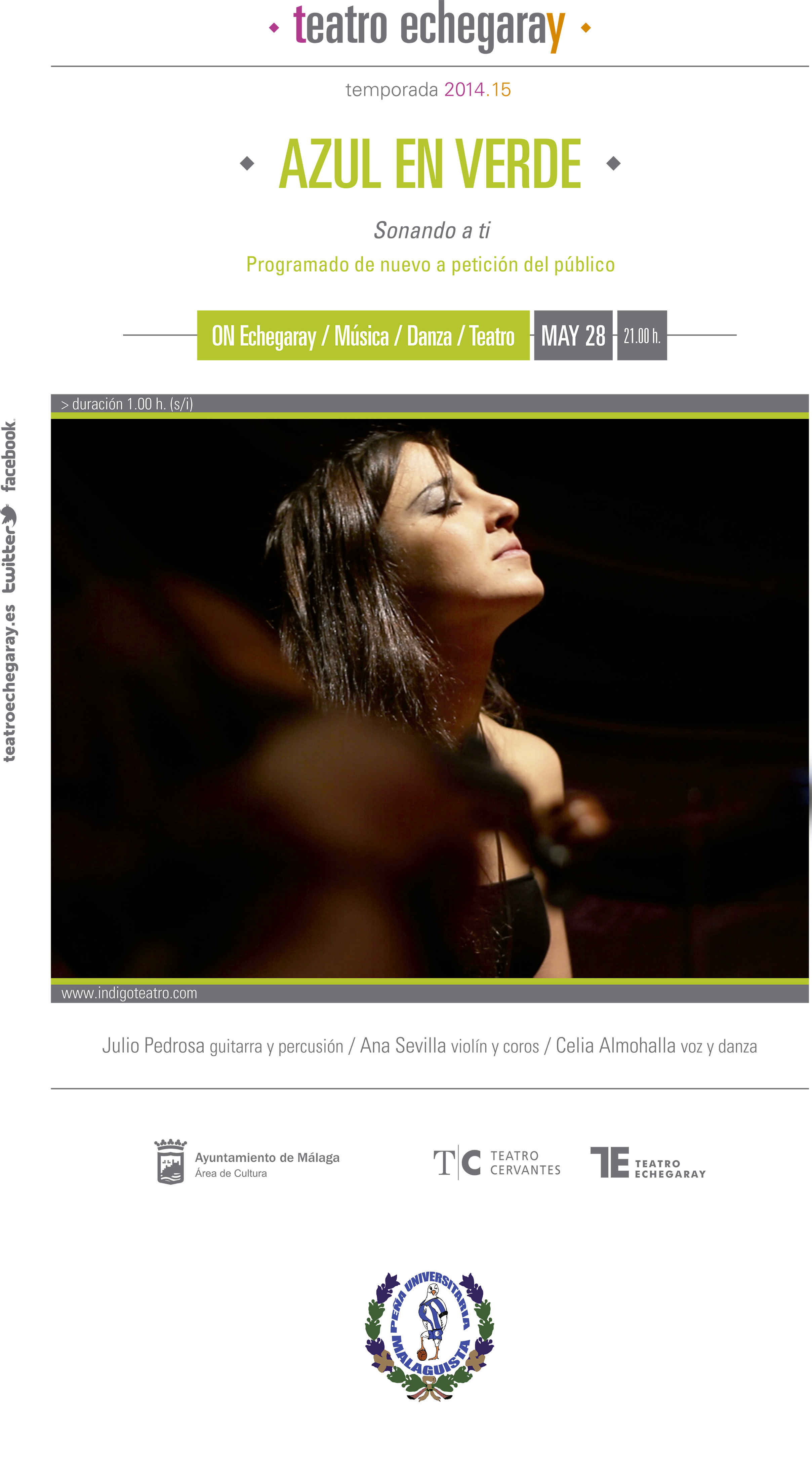 El próximo jueves 28 de Mayo a las 21:00 horas, Azul en Verde llenará el escenario de el Teatro Echegaray con su obra Sonando a ti, un concierto contemporáneo totalmente original que ofrece una puesta en escena teatral a través de un guion que hace de hilo conductor entre temas y canciones por medio de recital, danza e interpretación.