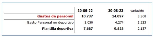 El desglose de los gastos de personal entre plantilla deportiva y no deportiva es la siguiente: