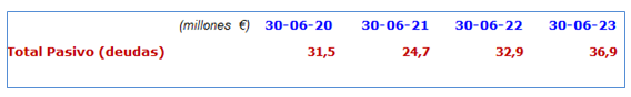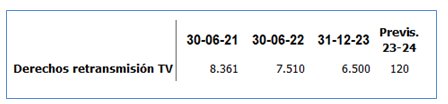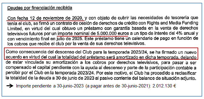 El importe total de la financiación con CVC asciende a 44,653 mill. €. Se firmó el 25-nov-21 y tiene un plazo de 50 años. A 30 de junio el Málaga había dispuesto de 22,4 mill., pero como ya se han devuelto 0,7 mill. el saldo como deuda en el balance es de 21,776 mill.