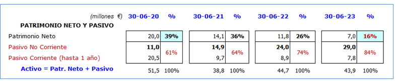 Resulta preocupante, además del incremento de la deuda, la estructura de financiación del balance, con un peso cada vez más pequeño del patrimonio neto (a ese porcentaje lo podríamos llamar solvencia del club):