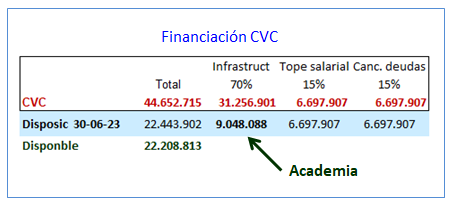 En el siguiente cuadro muestro las distintas finalidades que tenía el préstamo con CVC (15% + 15% + 70%). Dando por sentado que los 15% se han gastado efectivamente en tope salarial y refinanciación de deudas, el resto es el importe destinado a la Academia.